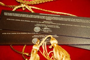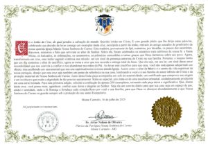 Certificado de Originalidade – Documento oficial que atesta que a cruz foi confeccionada a partir da madeira do assoalho original da Igreja Matriz de Monte Carmelo-MG, preservando sua história e valor espiritual.